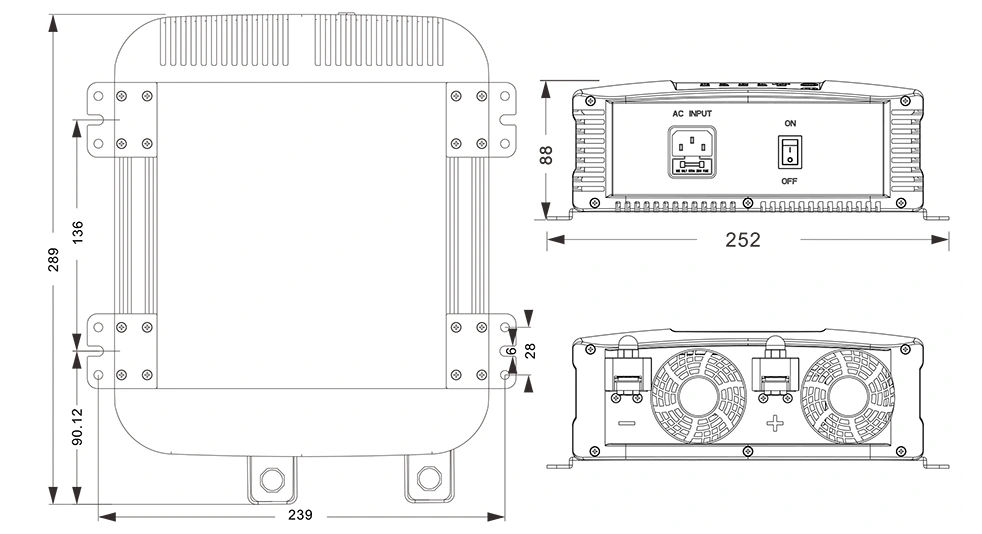 मेकानिकल रेखाचित्र: (289 × 252 × 88 मिमी)